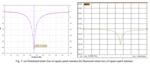 Microstrip antennas have many advantages over conventional antennas such as low profile, ease of integration with active and passive devices, ability of mounting on planar, nonplanar and rigid exteriors to form MICs and low manufacturing cost due to use of printed circuit technology [1-3]. In case of planar antennas designed for wireless communication systems, it is necessary to have a compact size antenna configuration that can be integrated with other devices. Since the physical area of the microstrip antenna is inversely proportional to the frequency, it is difficult to achieve a compact size antenna for modern communication systems for WLAN, WiMAX and WiFi applications, particularly with normal patch geometries having acceptable efficiency and isolation values. There is often a tradeoff in realizing compact antennas while maintaining their performance characteristics. Traditional patch antenna using rectangular, circular or triangular geometries under normal conditions resonate at a single frequency and have inherent low bandwidth and gain values limiting their potential applications. Present day communication systems need dual or triple frequency operation with higher bandwidth. Microstrip antennas for dual frequency applications have been realized by exciting patch geometry by using a single [4] or dual feed [5] arrangements. Several researchers have studied the performance of bow-tie microstrip antennas and have reported either enhancement in bandwidth [6-8] or possible operation at two or more frequencies [9]. Some other works [10–12] applied different kind of notches in regular shaped microstrip antennas to improve their impedance bandwidth or to obtain multiple resonant frequencies with same antenna. Chen and Chia [11] applied suspended notched square probe fed plate over the ground plane to attain impedance bandwidth around 20 %. Shackelford et al. [12] considered a probe fed notched square patch antenna with a shorting post to attain bandwidth of the order of 13 %. In the present communication, we have considered a more simplified antenna structure by applying triangular notches on opposite edges of a square patch antenna and changed the depth of notch tip to optimize and attain best performance. This geometry is somewhat like a bow-tie antenna which are planar equivalents of the biconical antenna [13] that has wideband characteristics. However, in this communication, variations are made in the simple rectangular patch geometry where the notch tips are relatively far away than that in bow tie antenna. II. ANTENNA GEOMETRY AND RESULTS In the present paper, radiation performance of a square patch antenna with two nothes on its opposite edges is considered and is compared with a normal square patch antenna. The antennas are simulated using IE3D [14] and later designed on glass epoxy FR4 substrate (Єr = 4.4, tanδ = 0.002, substrate thickness 0.158 cm) with copper as its ground plane [15].