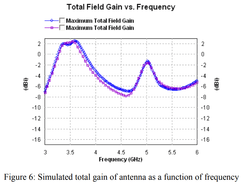 1. Resonance Frequencies : The antenna resonates at two distinct frequencies within the 3.25-3.85 GHz band, which is designated for WiMAX systems by the IEEE 802.16 working group.